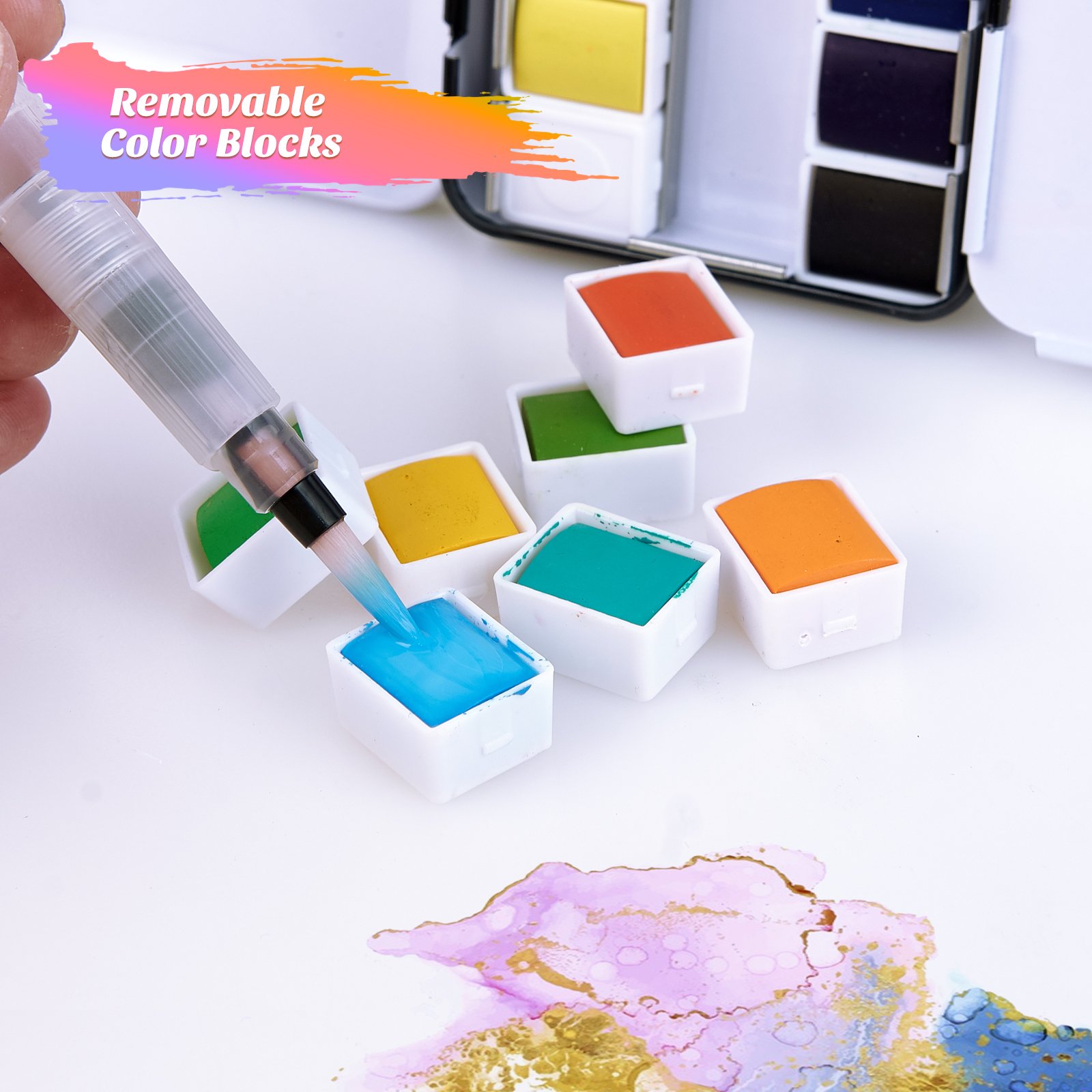 - [REMOVABLE COLOR BLOCK]: Each small color block in the watercolor set can be removed separately, which can effectively avoid dyeing between different colors. After the color block is used up, refills are available, making it a sustainable investment for long-term use.